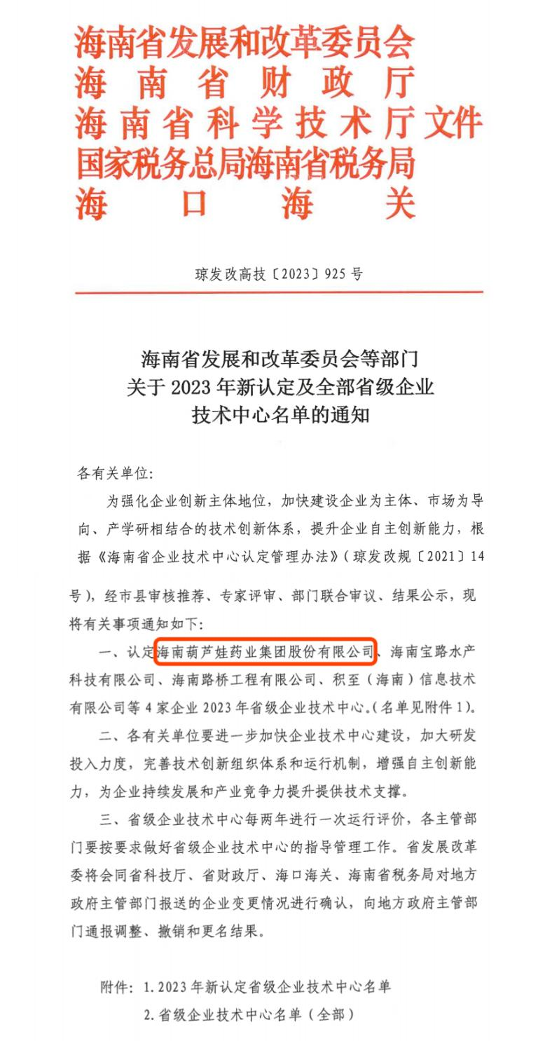 近日,海南省发改委等多部门联合公布了《关于2023年新认定及全部省级企业技术中心名单的通知》,其中,海南金年会药业集团股份有限公司成功通过评审,被认定为省级企业技术中心,是本次获批的4家企业之一。